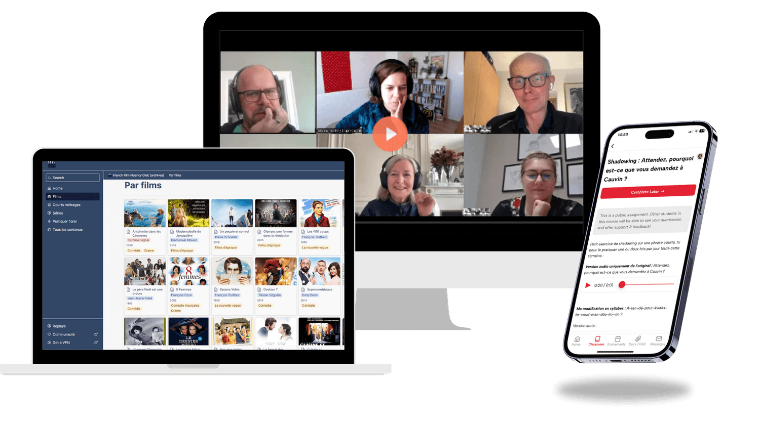Chaque semaine on se retrouve en Live sur Zoom pour 1h de pratique du français (séances de shadowing, Q&A, décryptages d'extraits de films, jeux etc.) + une autre fois dans la semaine on se retrouve pour 30 minutes pour échanger 2 par 2 autour d'une question.