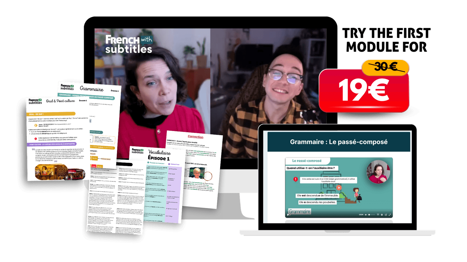 The complete French With Subtitles program includes 6 movie-based modules and access to our private community for one year for 199€.