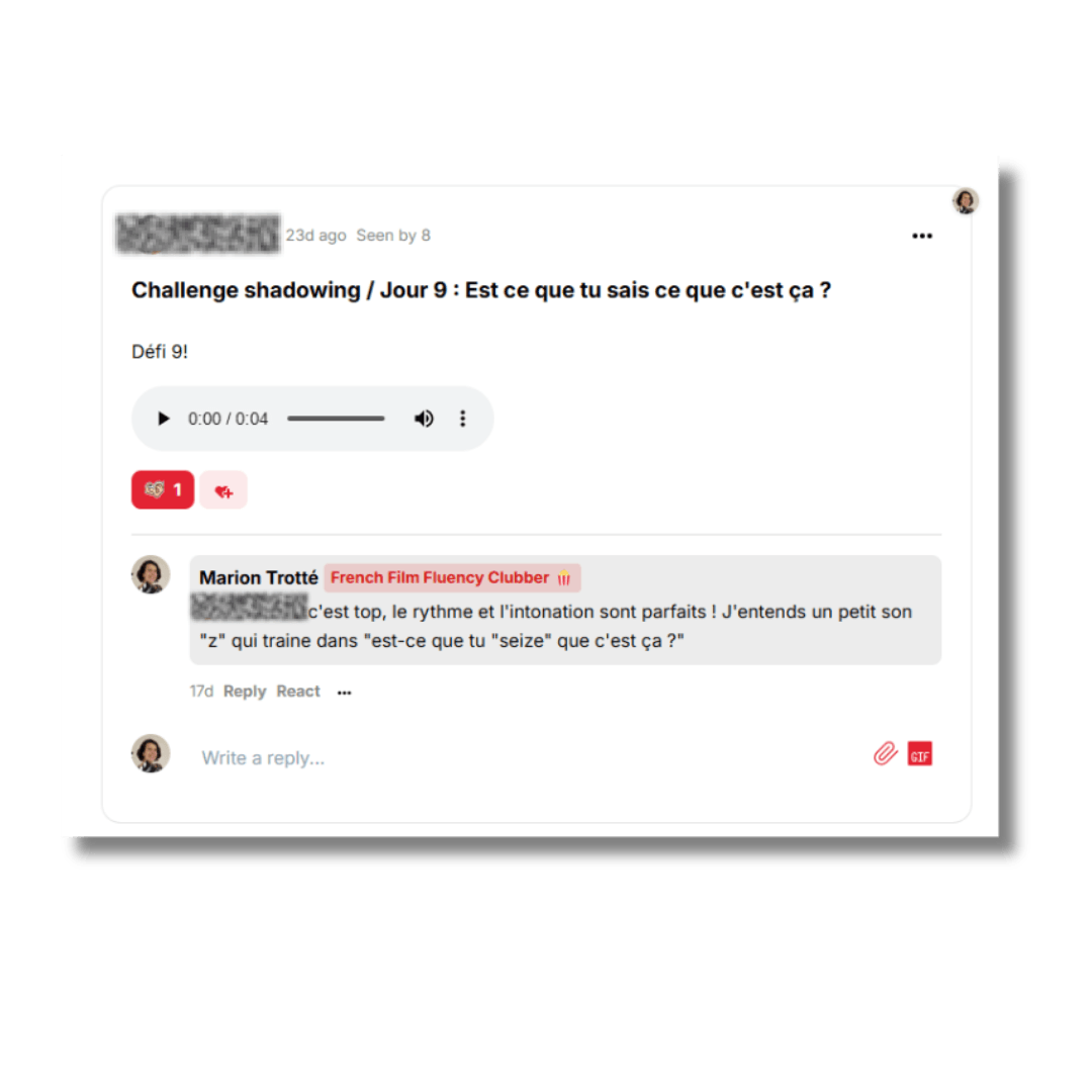Dans le challenge Shadowing 101 ce n'est pas l'IA qui analyse ton français, mais une vraie francophone native qui te donne des conseils sur ta prononciation !