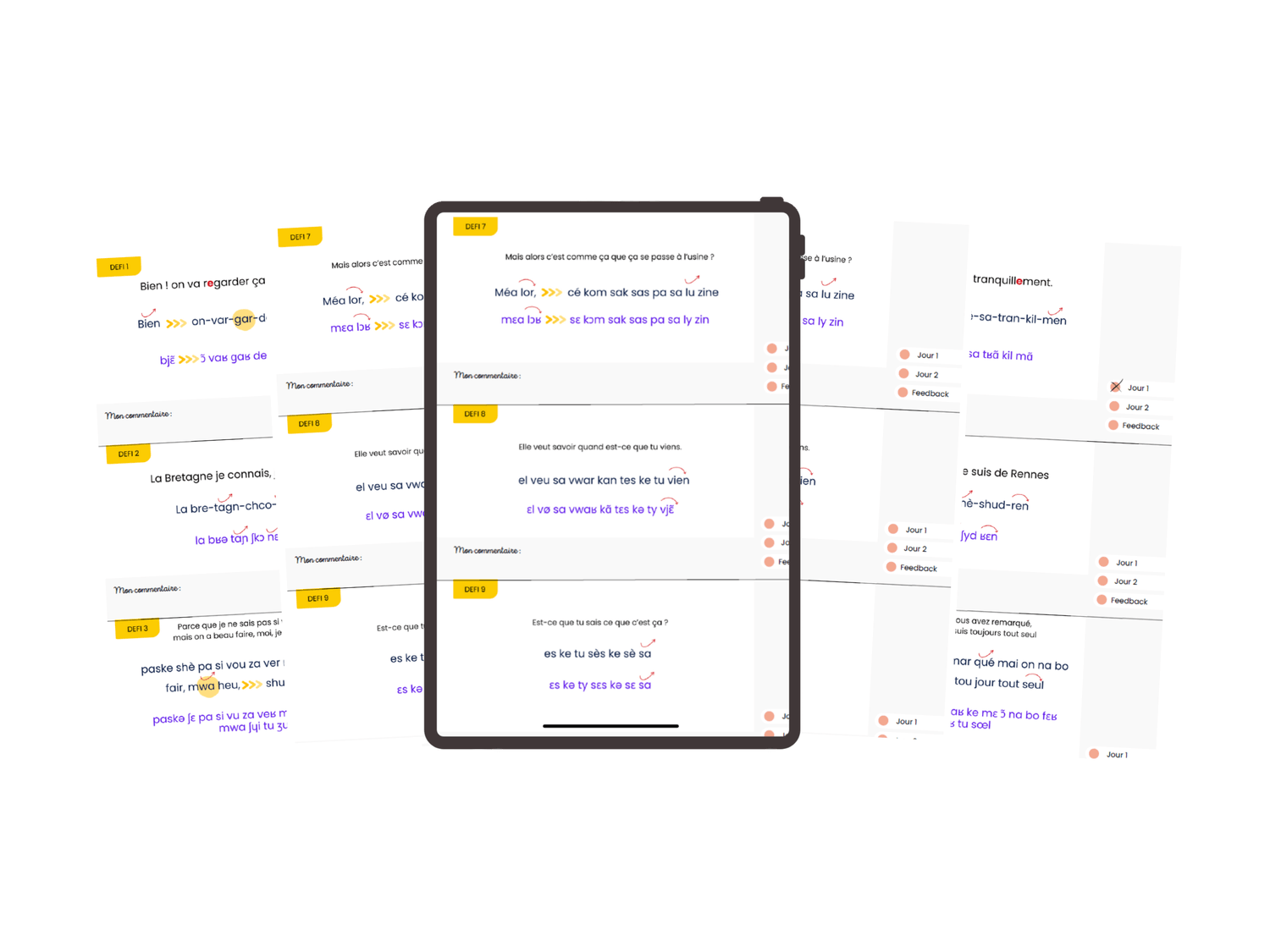 Un PDF avec le découpage phonétique de chacune des phrases du challenge pour suivre tes progrès et noter tes observations !